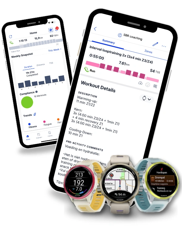 Je traint via TrainingPeaks en kunt al je workouts automatisch exporteren naar je Garmin, Polar, Zwift of Apple Watch. Zo volg je elke sessie realtime, zonder gedoe.